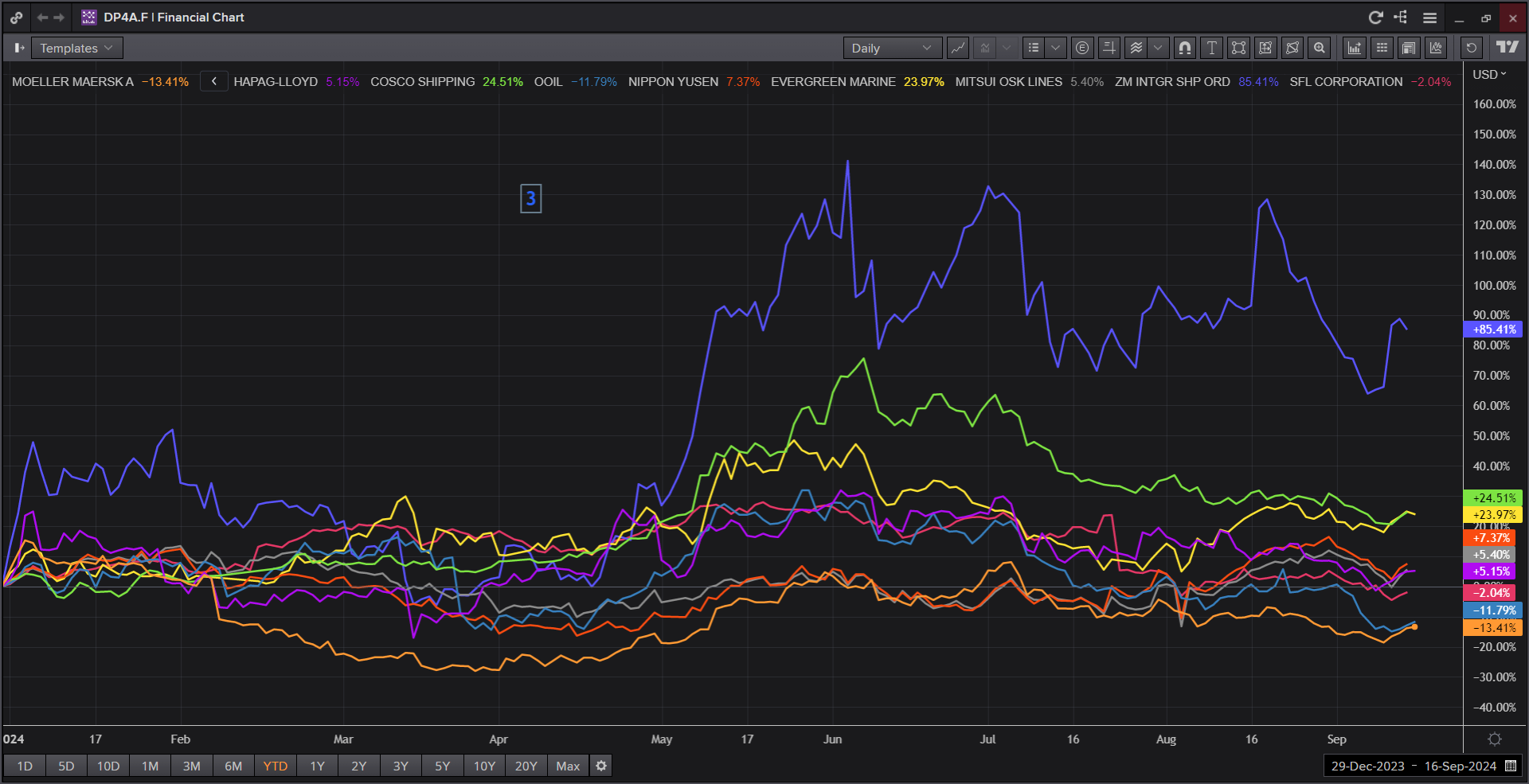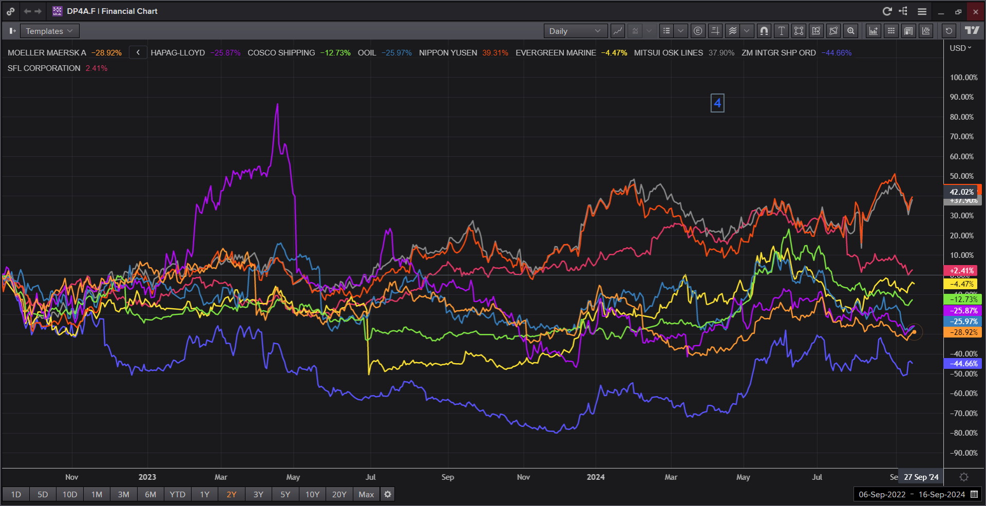 Equity Performance : While ZIM has shown strong year-to-date performance, its results over a two-year period are less impressive. This trend is mirrored by most major shipping lines, which, despite benefiting from higher freight rates in the first half of the year, have not achieved the remarkable performance levels seen in previous years (see pictures 3 & 4).