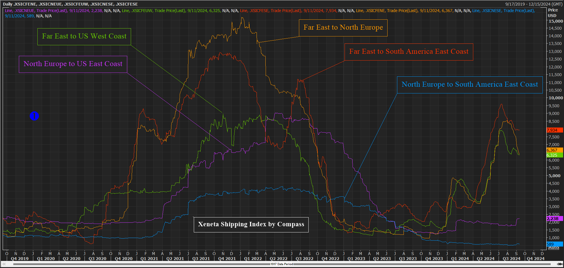 Global Container freight rates continue their downward trend, which started in July (see picture 1).